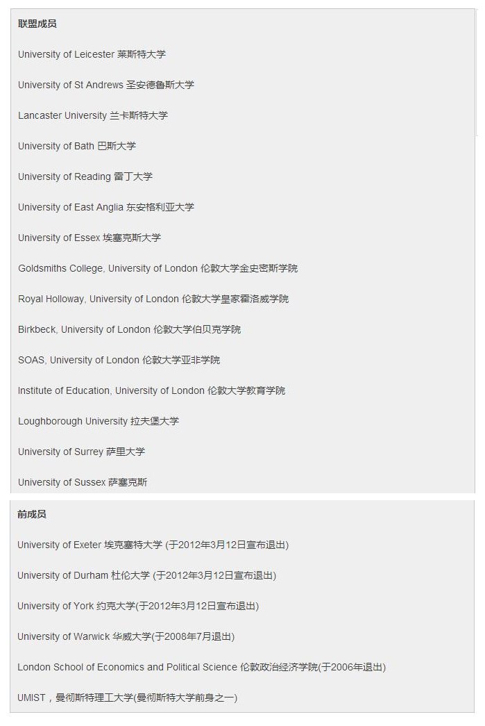 1994 Group也稱為1994年大學(xué)聯(lián)盟,在1994年成立,主要是一些英國(guó)規(guī)模比較小的研究型大學(xué),旨在維護(hù)與羅素大學(xué)聯(lián)盟的競(jìng)爭(zhēng)中保護(hù)好自己的利益。1994 Group給自己的定義為:國(guó)際認(rèn)可的英國(guó)大學(xué),有著共同的目標(biāo)、標(biāo)準(zhǔn)及價(jià)值觀。其主要目的就是提供一個(gè)英國(guó)研究型大學(xué)互相合作的框架。