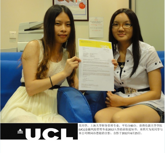優(yōu)越教育中國區(qū)資深顧問Katrina:正常情況下,申請這個專業(yè)需要211院校,平均分80分,而且學(xué)生本身的背景也跟目標專業(yè)有一定的差距。我們在仔細研究了學(xué)生的所修課程后,建議了學(xué)生的實習(xí)方向,找跟目標專業(yè)相關(guān)的公司去實習(xí),通過我們優(yōu)越教育合作的龐大網(wǎng)絡(luò),推薦了一家大型外資銀行讓學(xué)生去實習(xí),出具了比較優(yōu)質(zhì)的推薦信。同時,通過跟學(xué)生溝通,盡力通過學(xué)生的生活和學(xué)習(xí)經(jīng)歷、家庭背景,在PS(個人陳述)里面挖掘出學(xué)生學(xué)習(xí)風(fēng)險管理的潛力。同時由于公司倫敦總部與英國全部大學(xué)很好的合作和交流關(guān)系,跟UCL相關(guān)老師有效溝通,加深了學(xué)校對該生的印象。經(jīng)過了長達3個月的等待,我們終于收到了UCL發(fā)來的錄取通知書。