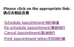 看好你的GWF號碼(在你的確認郵件里找),登陸簽證預約頁面開始預約你遞交材料的時間。這個頁面上四個選項,你需要點擊的是“預約申請”,當然,從此可見如果你要重新預約,取消預約或者打印預約單,你同樣需要來這個頁面進行操作。