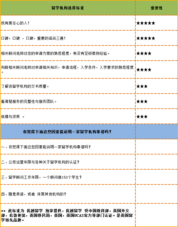 在合適地設(shè)定了我們的期望后,就到了很關(guān)鍵的一步,如何判斷一個(gè)留學(xué)機(jī)構(gòu)是否靠譜。優(yōu)越教育陳老師表示,這也是最讓同學(xué)們頭疼的地方。。。下面,我們特意做了一個(gè)問卷,這里優(yōu)越教育承諾,就算你不選擇優(yōu)越教育,請(qǐng)你帶著這個(gè)問卷去上門分析每家機(jī)構(gòu)到底靠不靠譜(我們不收版權(quán)費(fèi)~~~),如果這個(gè)問卷不管用的話,回來找優(yōu)越教育陳老師,她給你做免費(fèi)申請(qǐng)~~~