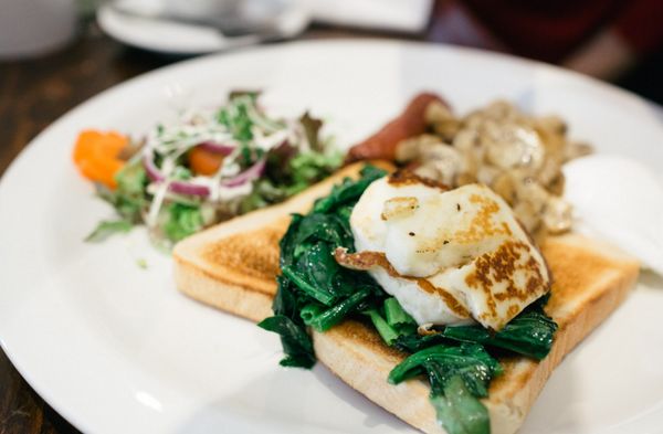 哈羅米芝士,小胡瓜油煎餅,香芹沙拉再加上一個荷包蛋,一份完美早餐完成。