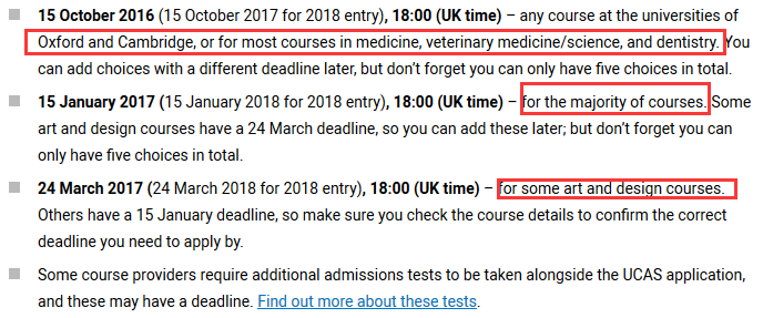 1)申請時間:不同課程的截止時間(deadline)不同,牛津、劍橋2所學校&醫科類專業稍早(10月15日截止),藝術設計類專業稍晚一些(次年3月24日),其他大多數專業的截止日期比較統一(次年1月15日)。