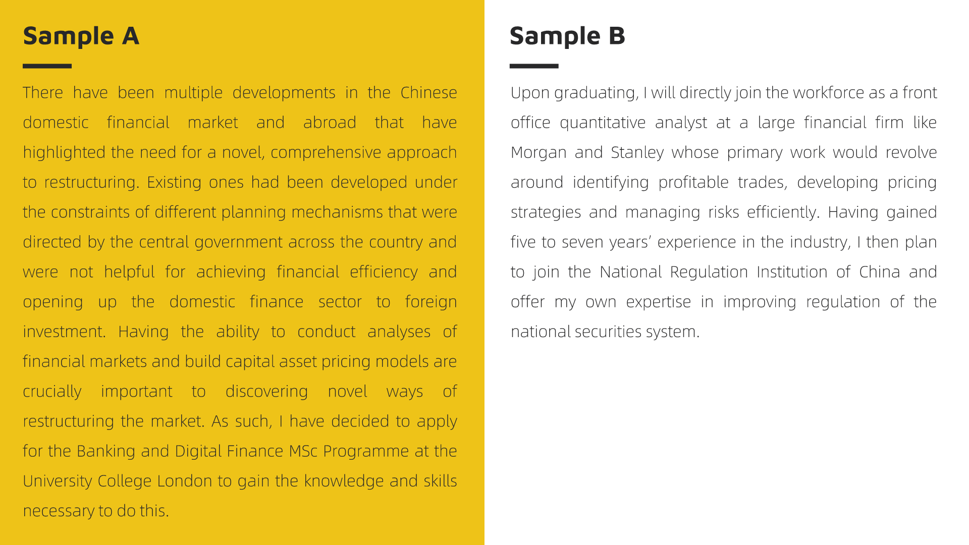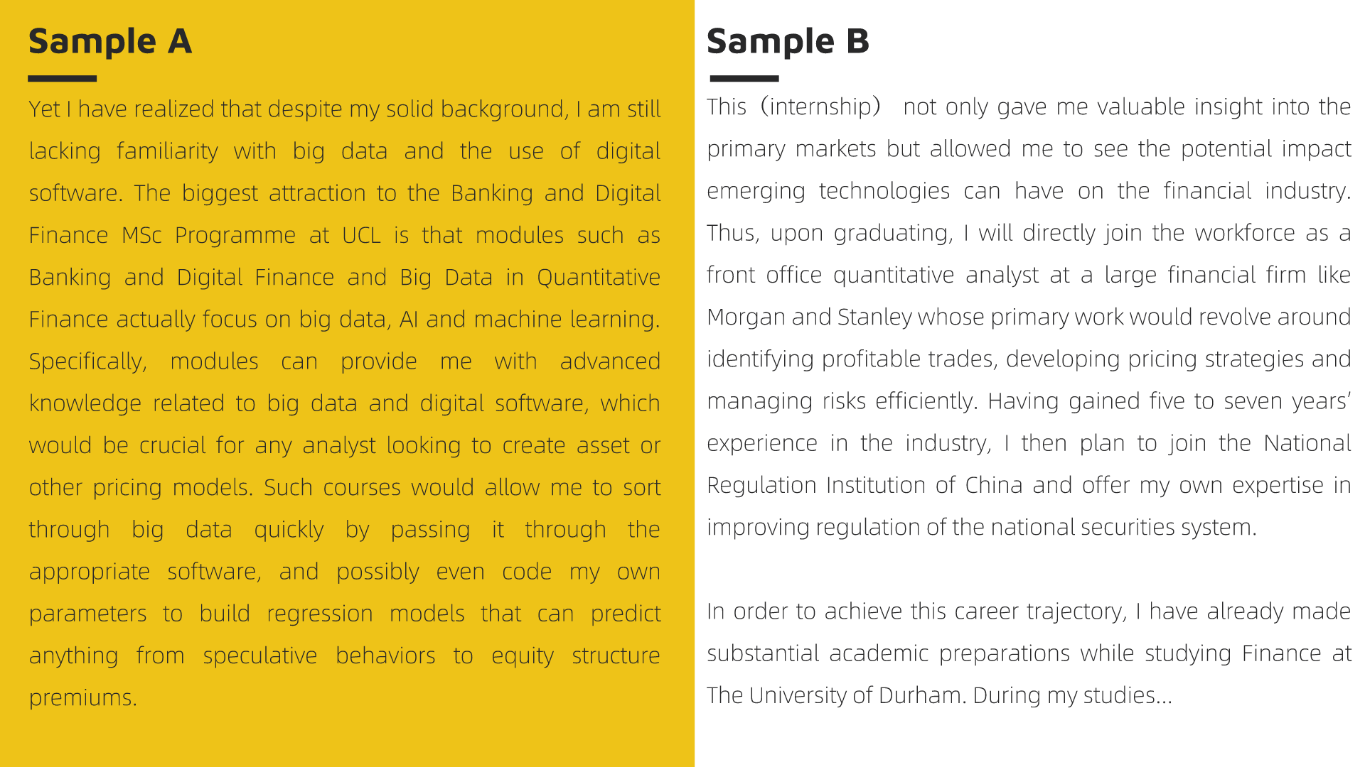 每一個招生官都需要查閱幾百份申請文書,如何在眾多文書中脫穎而出至關重要。文案會根據學生的信息反饋,為學生塑造一個獨特富有個性的優質形象,并且會要求學生對行業以及專業的進行深入思考,對于學生問卷中內容能進行有效的延展,能結合學生自身情況和專業要求進行信息整合,側重院校要求,補充最豐富最生動的細節。