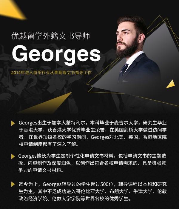 留學申請高端時代來臨,海外院校對于申請人的考察體系綜合性更強,考核維度也更加多元。想要在激烈而復雜的留學申請競爭中獲得優勢,優質的申請文書材料是重中之重。優越留學2020年全新升級的“至臻系列”留學服務產品重點在于對申請文書質量的提升,組建了由Georges領銜的一批具備海外名校教育背景且具備豐富的海外頂級院校申請文書指導經驗的外籍文書指導團隊,全面升級優越留學的文書產品體系,為選擇優越的學生提供具備極具競爭力的申請文書材料,助力世界頂級名校申請之路。