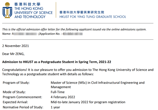 院校:The Hong Kong University of Science and Technology 專業:Master of Science Programs in Civil Infrastructural Engineering and Management