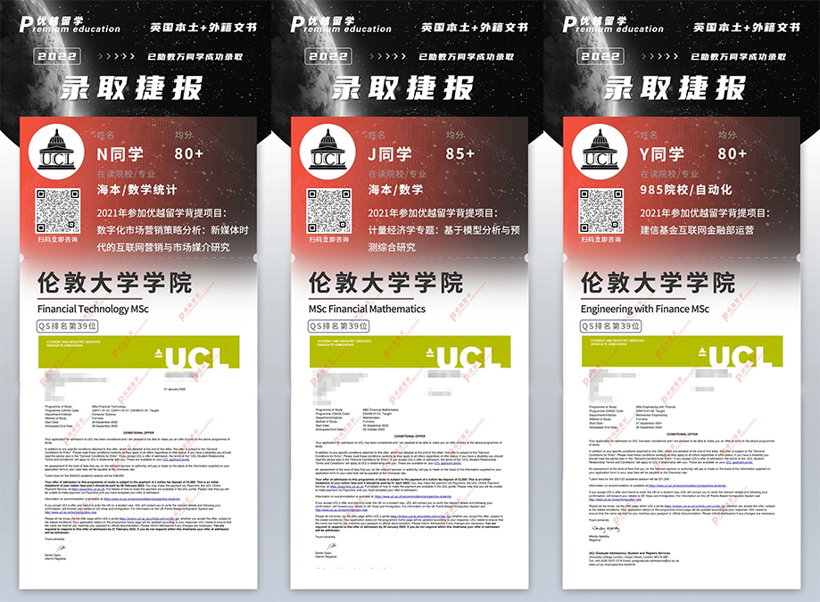 根據(jù)優(yōu)越今年的UCL拒錄情況來看,UCL金融經(jīng)濟等相關(guān)專業(yè)錄取的同學,都是985/211院校背景或英本背景,均分70+。整體來看,優(yōu)越收到的offer中UCL是最多,所以同學們?nèi)绻盒1尘案偁幜Σ粔颍窒肷暾圙5的,可以試試UCL。