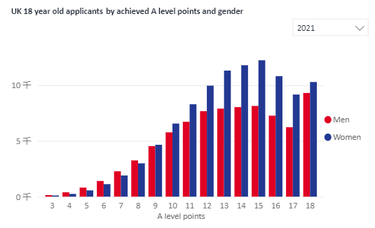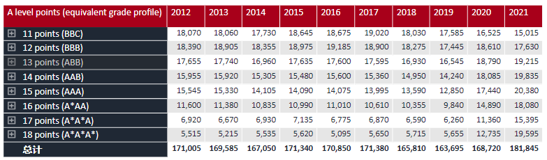 去年,我們切身體會到了Alevel分數的急速膨脹,2021屆英本學生,僅在英國地區獲得A*A*A*的申請者就有19595人,較去年增長54%!更是2019年5655人這個數字的3.5倍!