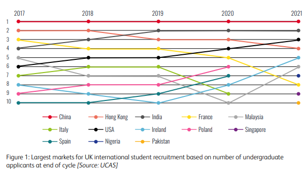 據UCAS官網數據顯示,每年赴英中國本科留學生數量都遠領先于其他國家或地區,常年位于英國國際留學生的最大輸出國的位置。