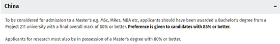 “申請人應獲得211大學的學士學位,均分最低需要達到80%以上,優先考慮均分85%以上的學生。”