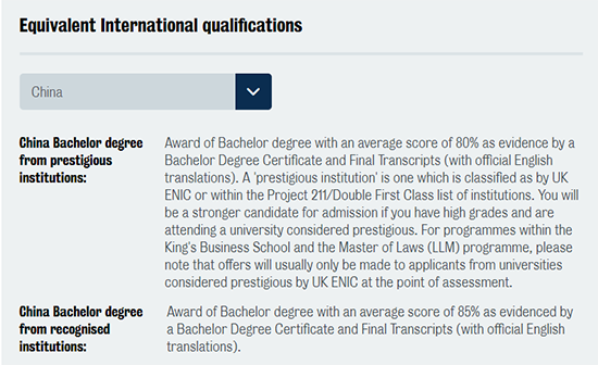 倫敦國王學院商學院和法學院,只接受來自“prestigious institutions”本科的中國申請者,即被英國ENIC評為prestigious的大學或者211/985雙一流大學,且均分不低于85分。