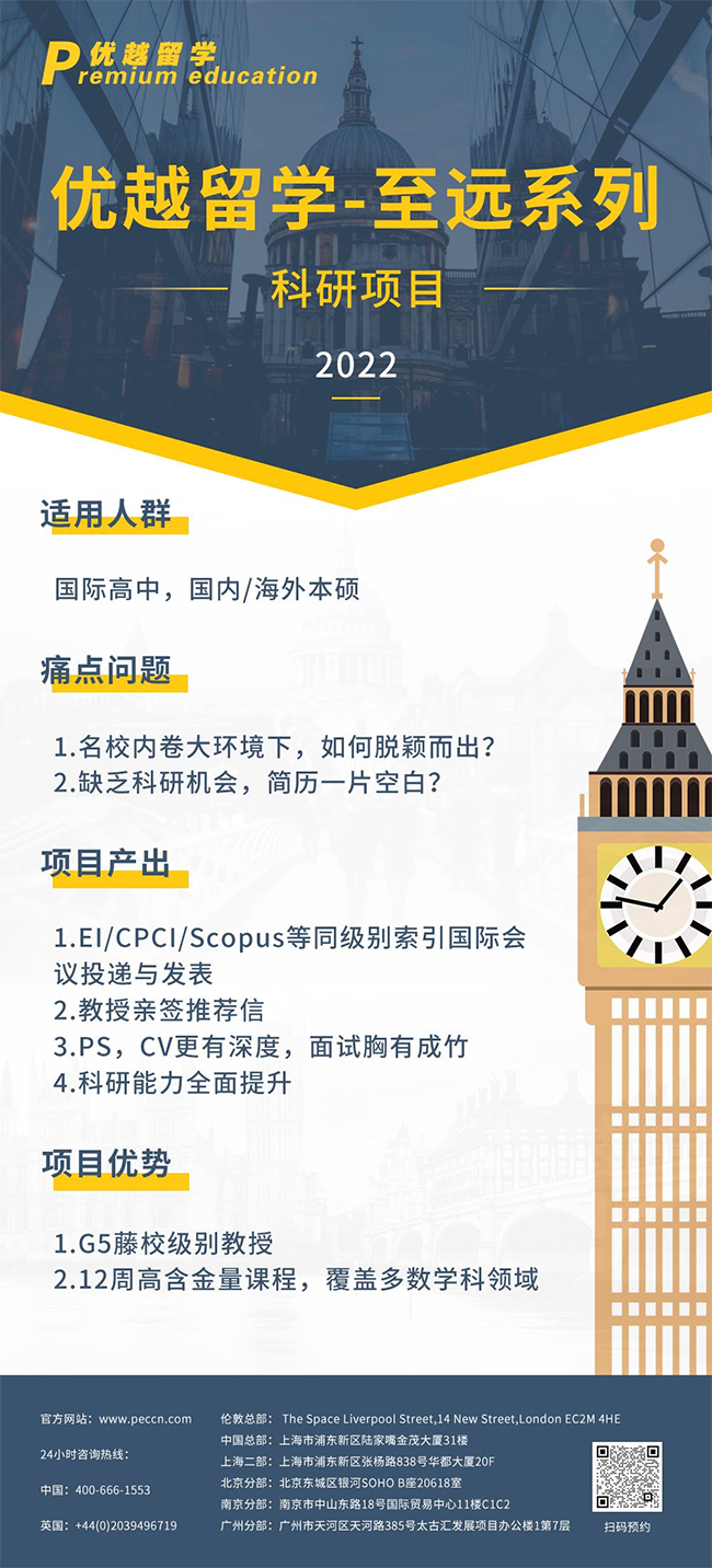 抓緊所有時間提高背景,把握每項可以提升背景的機會。優越留學推出碩士申請中的軟背景提升的科研項目以及實習項目等產品幫,能助同學在申請中更加有保障。如果各位同學有需要,可以跟優越的顧問老師咨詢,顧問老師會幫同學們推薦合適的背景提升項目。