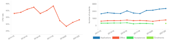 然而及時錄取率如此之低的情況下,LSE歷年來的申請人數仍在逐年增加。近五年LSE碩士申請的人數已經從2016年27737人上升至2021年40108人。然而offer發放率卻從2016年的30.4%下降到2021年的22.7%。