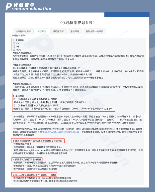 這一項任務主要針對正在準備申請材料、尚未完成遞交的同學。申請材料是一個非常令人頭疼的事,同學們可以看看優越老師給同學列的一份材料清單,很多都是要中英文,還要找官方或相關機構蓋章證明,不熟悉的同學很容易手忙腳亂。并且不同情況需要提交的材料會略有區別。