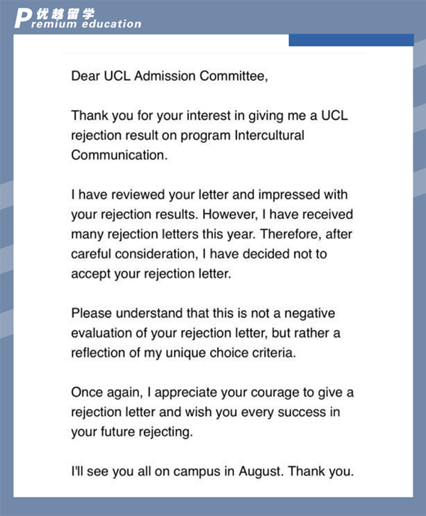 試問誰沒收到過幾封拒信呢?我拿到拒信后就“敬個禮、握握手”,天涯何處無芳草?因為顧問給我定校是按照沖刺——主申請——保底三個梯度來選學校,拿到?jīng)_刺的UCL拒信,我就對G5不抱希望了,重新申請了KCL。然后曼大也拒了我,不慌,華子在等我。申請留學本來就是雙向選擇的過程,與其把時間浪費在已經(jīng)拒絕你的人身上,還不如拿著愛的號碼牌換個隊再排......