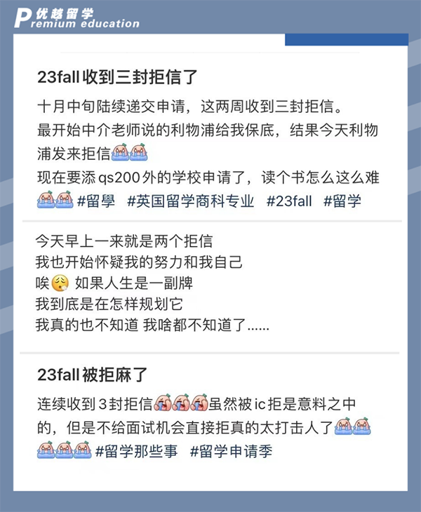 23fall英國留學申請一輪審理正在進行中,局部學校下起了“拒信雨”。據(jù)優(yōu)越君觀察,面對突如其來的拒信,不同的人有不同的反應。