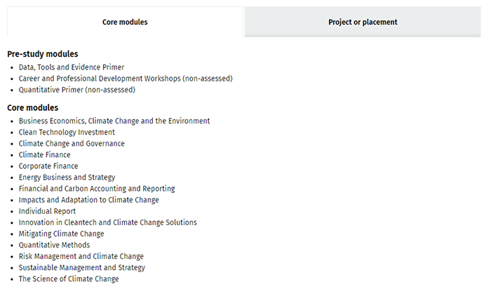IC的氣候變化、管理和金融(MSc Climate Change, Management and Finance),核心課程也包含了“企業融資”、“可持續經營與戰略”、“商業經濟學、氣候變化和環境”等于商科有關的課程。