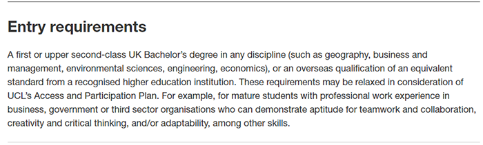 像UCL的MSc Business and Sustainability就鼓勵地理、商業和管理、環境科學、工程、經濟學等背景的同學申請;