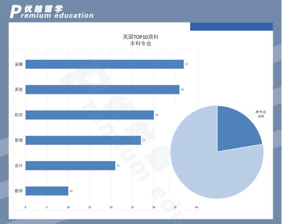 在今年英國TOP10商科的錄取同學中,本科背景并不僅局限在商科專業。本科就讀于金融學的申請者數量最多,而排名第二位的為經濟大類本科專業同學。另外跨專業申請商科的不在少數,心理學、法學、工科等等,跨專業的同學占比22%。