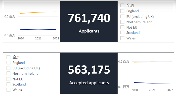 根據(jù)UCAS官網(wǎng)數(shù)據(jù),截至2022年申請(qǐng)周期結(jié)束,英國(guó)大學(xué)申請(qǐng)人數(shù)為761740,較去年的746120增加了15620個(gè)申請(qǐng)者,2022年最終的錄取數(shù)量為563175人,僅比去年增加了1115人。