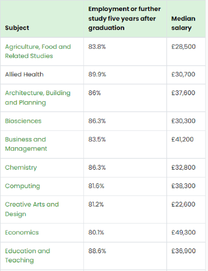有調查統計了英國碩士在畢業五年內的就業情況,大于85%的專業都屬于就業力較強的了,其中也包括近幾年在國內也逐漸火熱的生物科學專業、計算機方向,也有一直備受中國學生喜愛的商科專業。