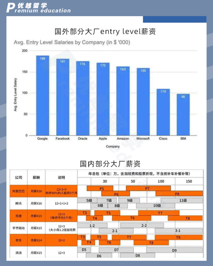這幾年互聯網行業飛速發展,數字化時代的進程非常快,海內外對計算機專業的人才也十分緊缺,根據2022年大廠招薪標準,互聯網行業的各崗位平均薪資在25W-55W之間,是各行業畢業生中薪資最高的工作之一。