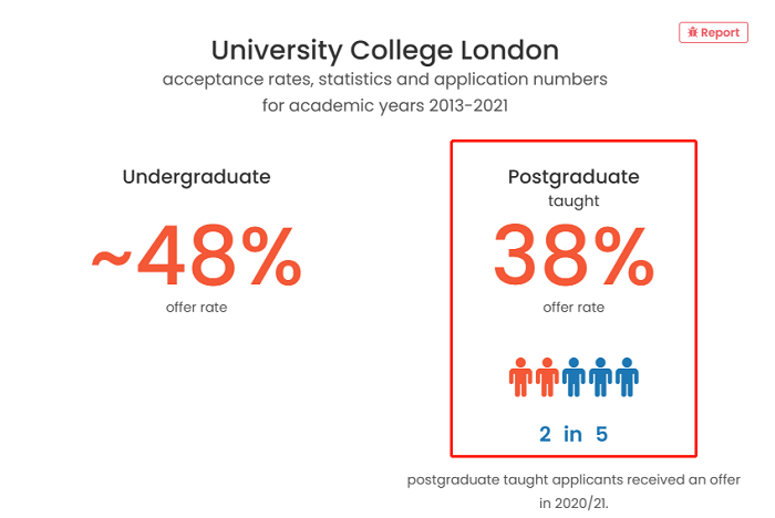 作為G5院校中開設規模最大、也是中國學生比較鐘愛的學校,UCL(倫敦大學學院)研究生專業的平均錄取率約為 38%。