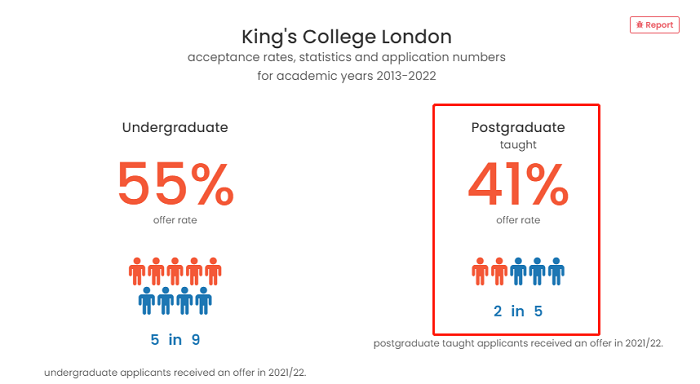 今年,KCL的研究生平均錄取率大概為41.08%,KCL旗下King's Health Partners是英國五大健康科學中心之一,所以世界第一牙科學、世界第二名的護理學還是競爭激烈,錄取率都在15%以下。