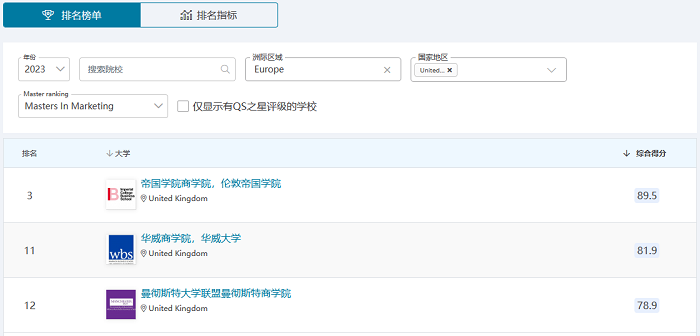 QS2023市場(chǎng)專(zhuān)業(yè)英國(guó)院校排名如下:
