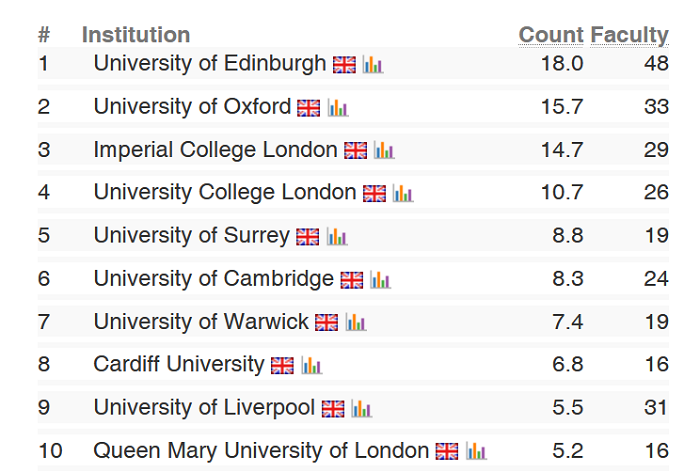 愛丁堡大學、牛津大學、帝國理工占據榜單前三。