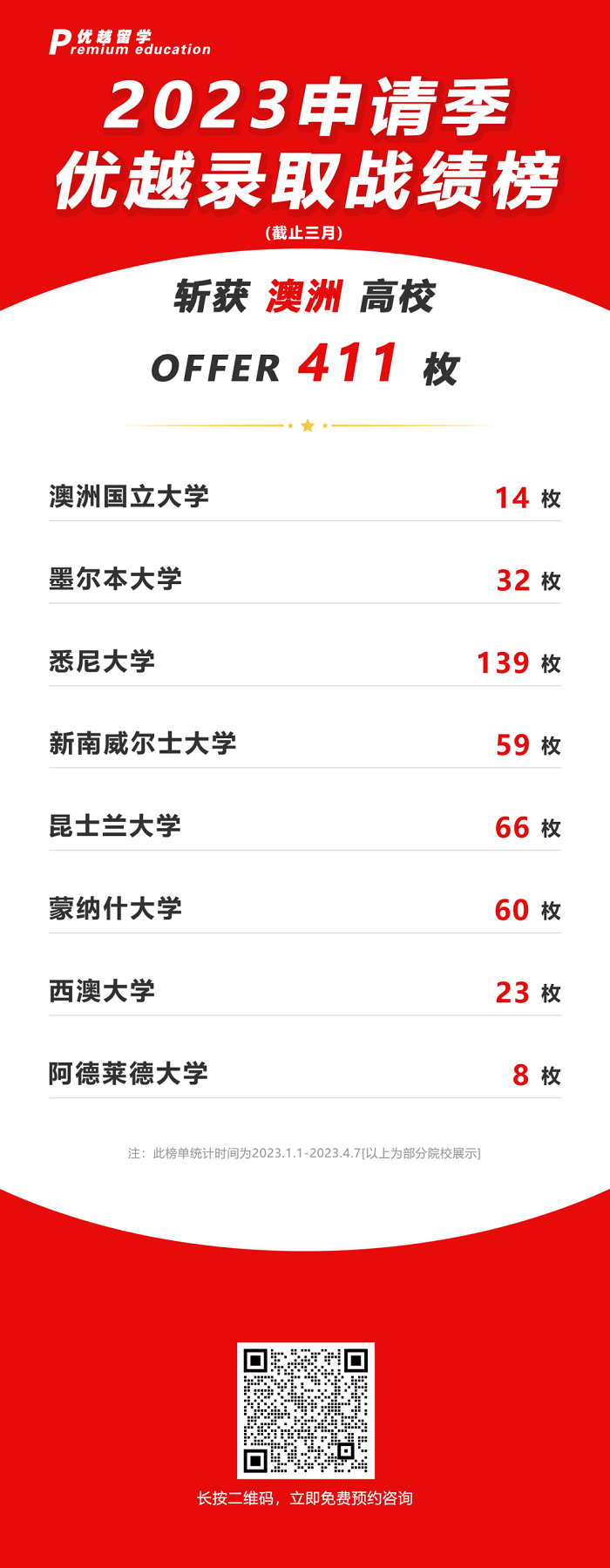 在23fall留學申請中,優越學員共收獲澳大利亞地區offer 411枚,其中96%的offer都來自澳洲八大。