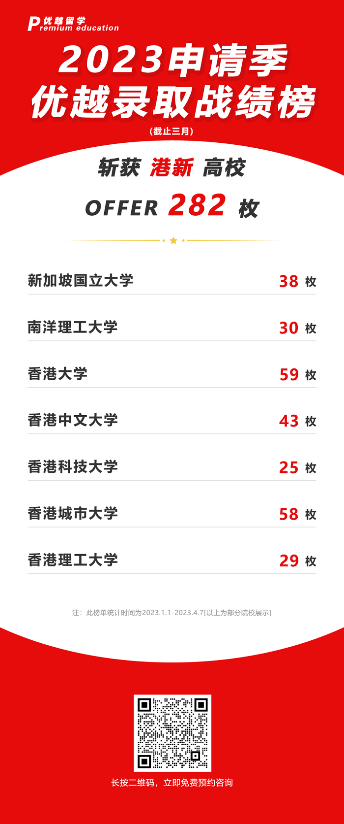在23fall香港+新加坡兩地區的申請中,優越學員共收獲282枚offer,其中94% 的offer來自“港三新二”。(即港大、港科大、港中文、新國立、南洋理工)