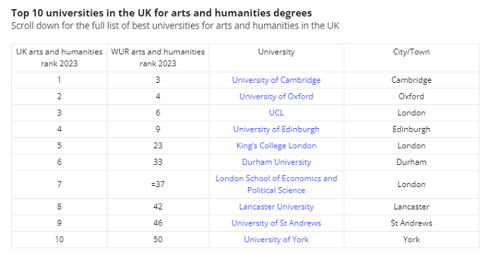 泰晤士報的英國藝術和人文學科學位排名前10的大學: