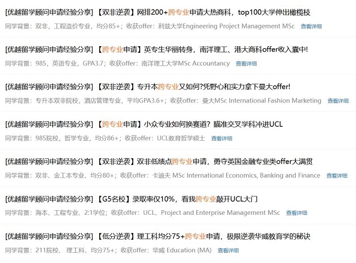 來看第二個(gè)也是最關(guān)鍵的問題,對(duì)于跨專業(yè)申請(qǐng)來說,考研成功率和留學(xué)申請(qǐng)成功率哪個(gè)更高?在我們優(yōu)越留學(xué)以往的申請(qǐng)中,有不少跨專業(yè)申請(qǐng)成功的案例,背景五花八門,文理工商都有。