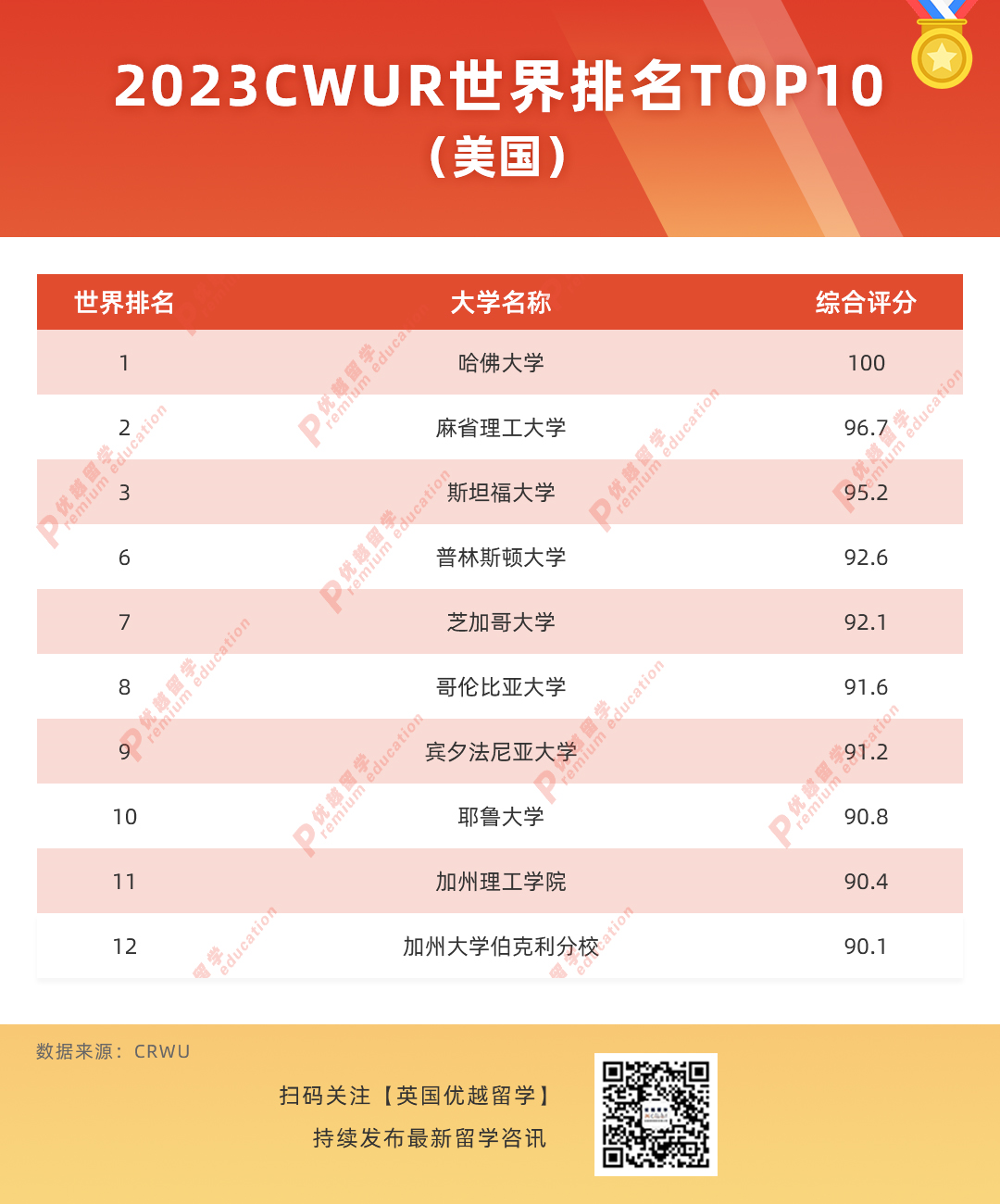 美國共有332所院校上榜2023CWUR大學排名,Top 100院校中有50所美國大學,占了半壁江山,Top10院校占8所,美國大學實力可見一斑。