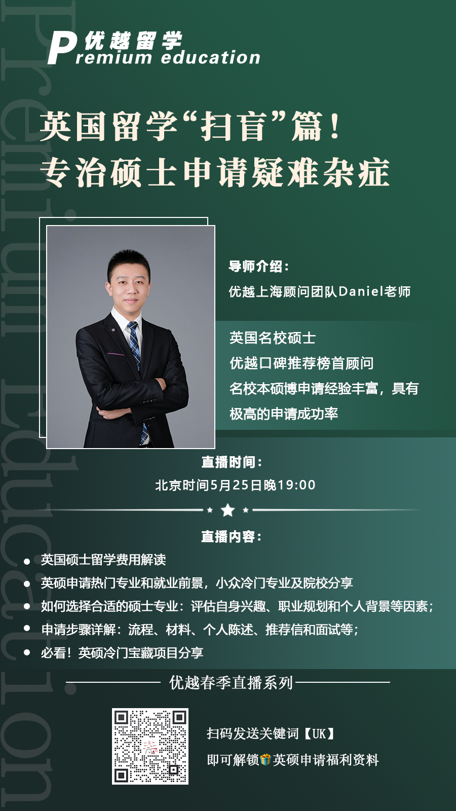 5月25日,優越線上講座春季篇之【熱門OR小眾?英國留學申請專業選擇攻略】預熱報名中。