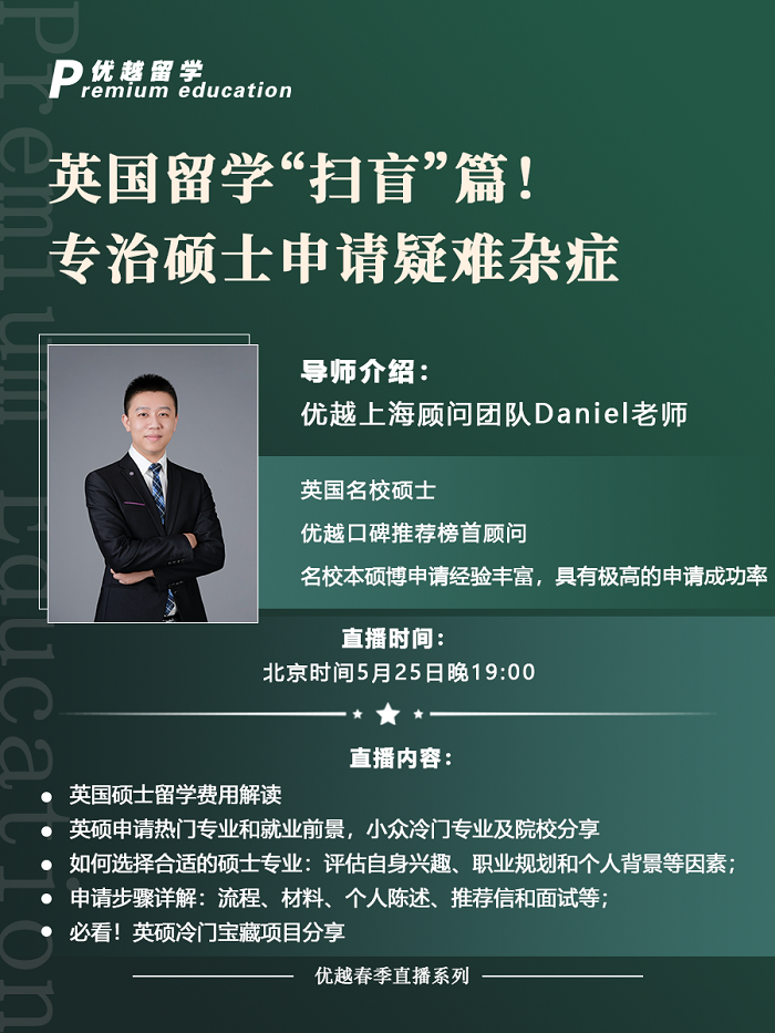5月25日,優越線上講座春季篇之【英國留學“掃盲”篇!專治碩士申請疑難雜癥】預熱報名中!
