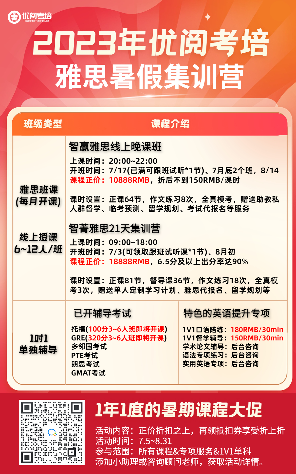 開班時間:7/3(可領取試聽課*1節)、8月初課程正價:18888RMB,6.5分及以上出分率達90%課時設置:正課81節,督導課36節,作文練習18次,全真模考3次,贈送單人定制學習計劃、雅思代報名、留學規劃等