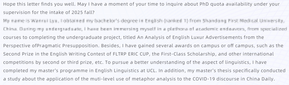 a.先會對學生過往經歷(包括但不限于本碩經歷)進行簡述,側重強調亮點經歷,如相關的學術經歷、已發表的文章、獲獎經歷等(參見下圖,來源于一位語言學專業學生的套磁信)。