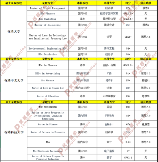 從23fall港三新二錄取結果來看,優越大部分錄取者都是國內211/985或海本的背景。像商科、計算機等熱門專業,211/985同學GPA至少3.5以上,雙非同學均分88起步,90分以上才有競爭力。