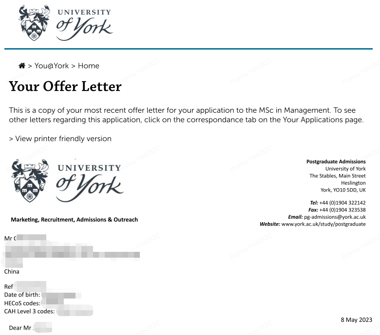 錄取院校:約克大學(xué)