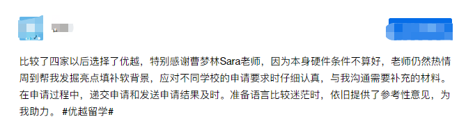 學生評價:學生們贊賞優越留學的文書質量,外籍文書老師的幫助讓文書變得與眾不同,從邏輯到用詞都非常地道。盡管公司規模不算大,但顧問們經驗豐富,給人以資深的印象。消息回復迅速,態度也很好,不會因為未簽約而對學生冷淡或催促簽約。