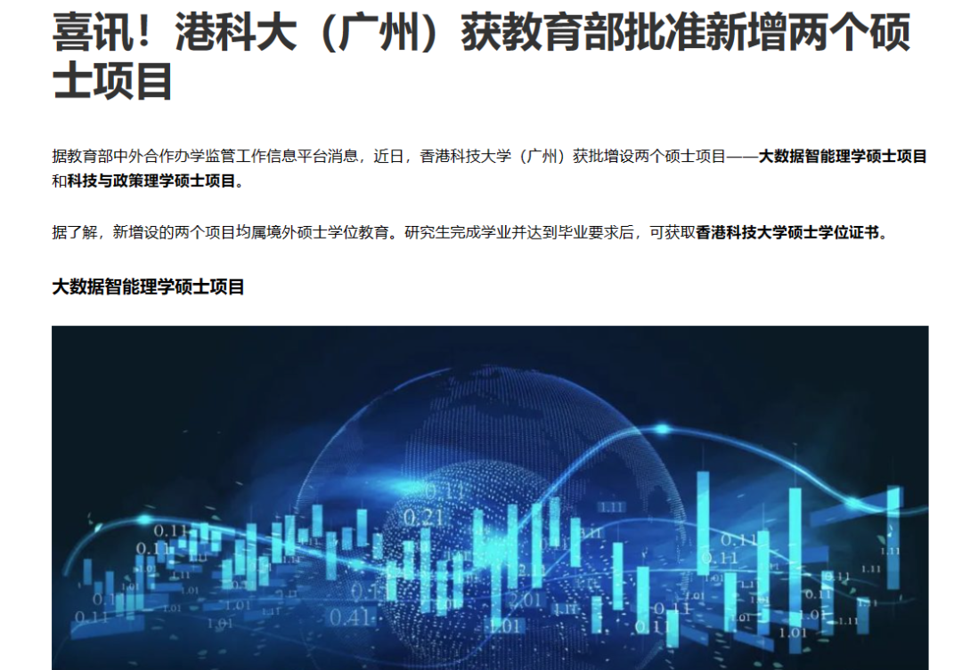 但現在,好消息終于來了!日前,香港科技大學(廣州)獲得批準增設兩個碩士項目,分別為“大數據智能理學碩士”和“科技與政策理學碩士”。