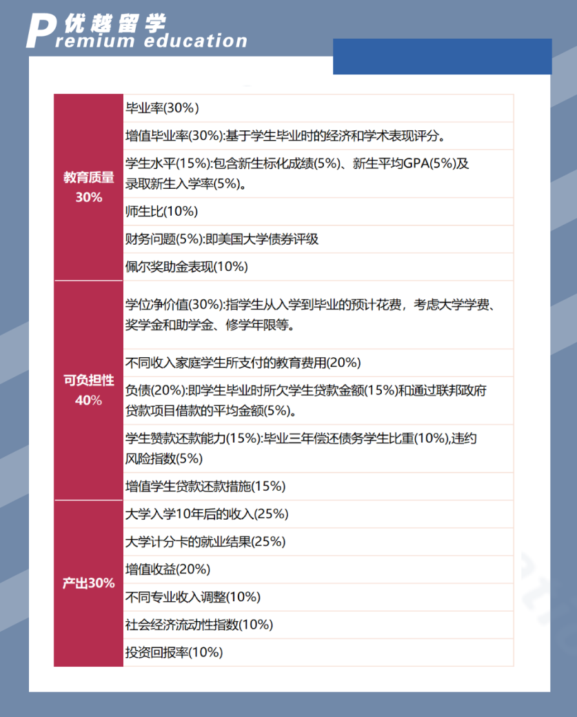 然后再根據3個類別(教育質量30%、可承擔性40%、收入30%)及其細分的總計26個因素對它們進行排名: