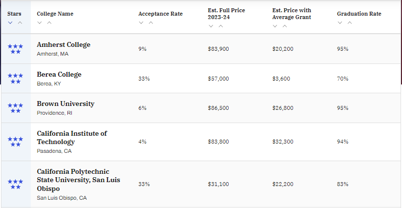 因此《Money》的評選機制力求綜合考量教育質量和投資收入情況,對700多所美國四年制大學進行了實用分析,將大學分為六個星級:2.5、3、3.5、4、4.5、5,其中5星為最高級。