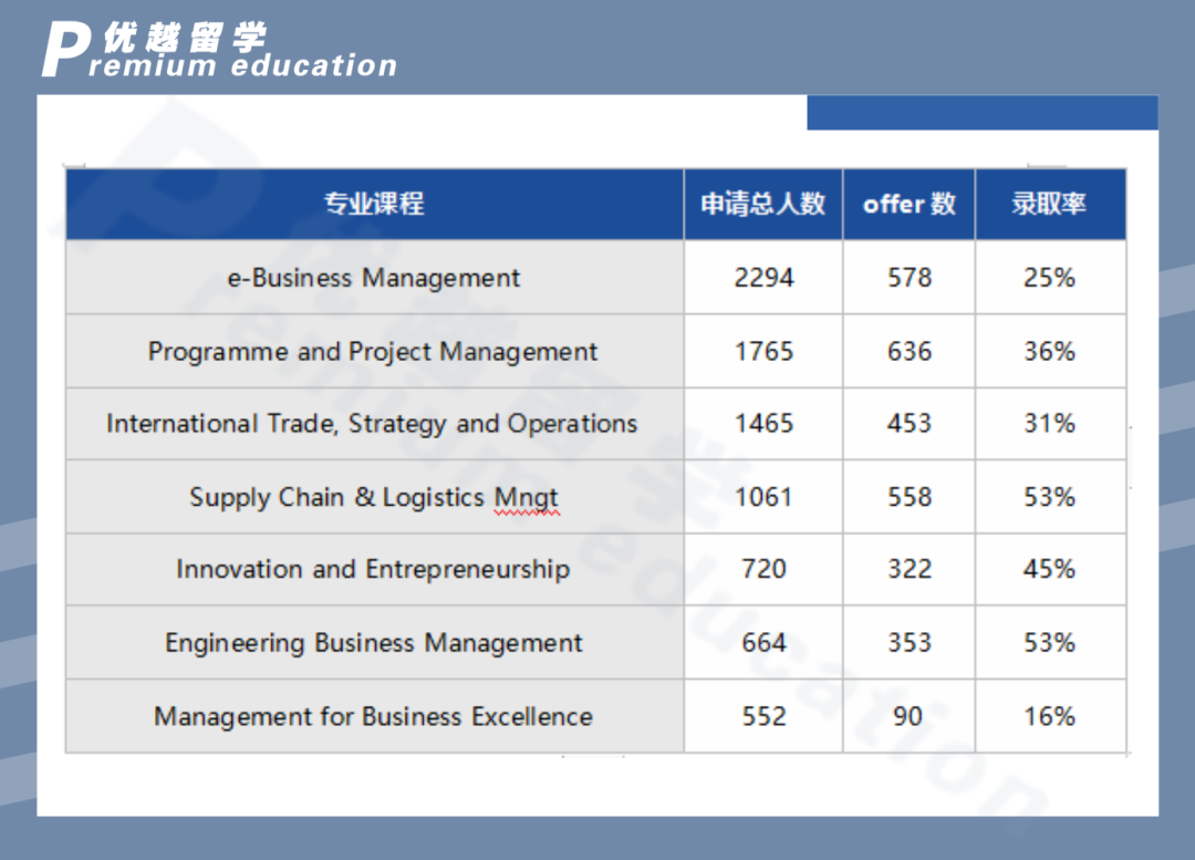 華威大學(xué)商學(xué)院競(jìng)爭(zhēng)非常激烈,申請(qǐng)人數(shù)最多,主要集中在以下7個(gè)專業(yè):