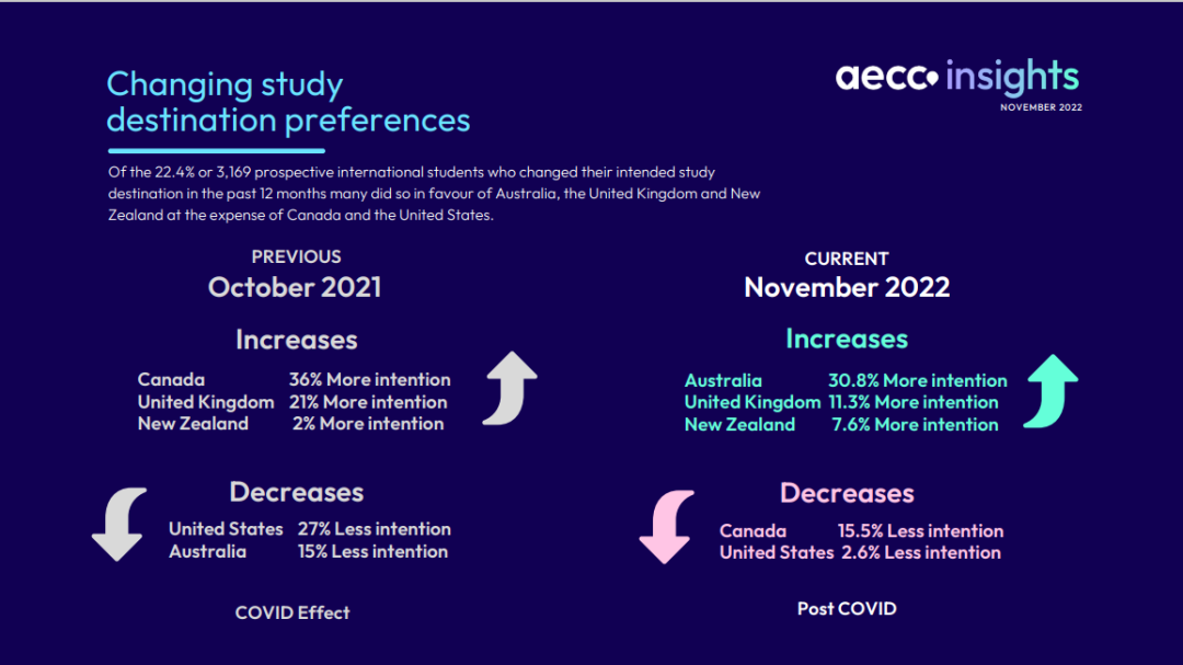 根據(jù)AECC洞察力學(xué)生調(diào)查的2022年全球留學(xué)趨勢報(bào)告,超過14000位來自147個(gè)國家和地區(qū)的學(xué)生參與了調(diào)查,發(fā)現(xiàn)有3169名國際學(xué)生改變了他們的留學(xué)目的地偏好。具體來說,對(duì)于澳大利亞、英國和新西蘭的選擇趨勢上升,其中澳大利亞的增長率最高,達(dá)到30.8%。