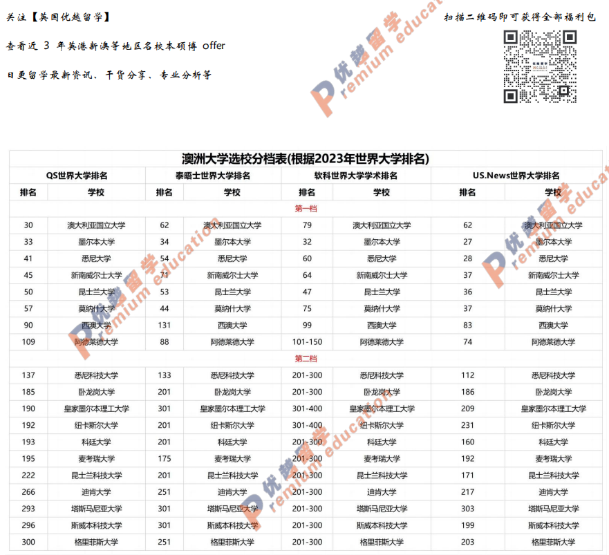 掃碼下圖還可免費查看澳洲大學選校分檔表,澳洲八大校各大世界排名一目了然。還可以選校表check自身背景條件是否滿足學校錄取要求哦!