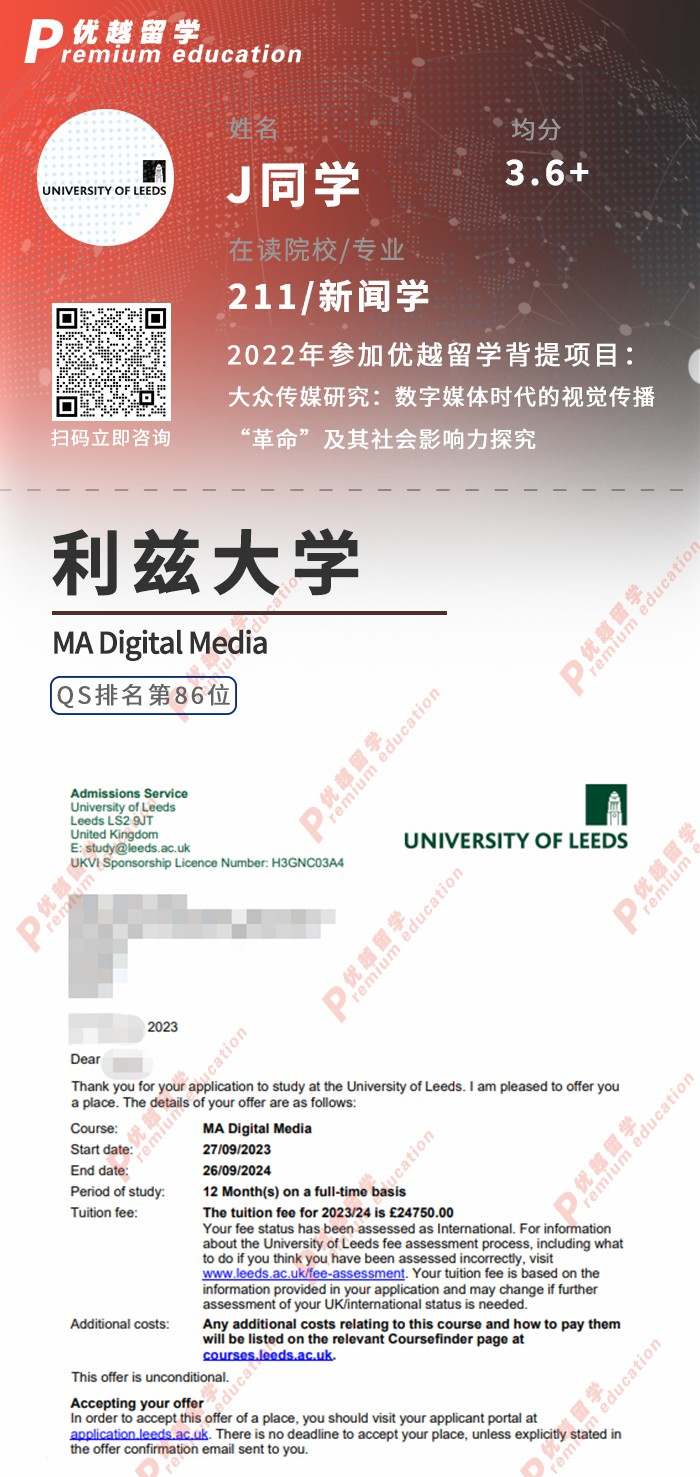 通過與優越留學的緊密合作,她成功獲得了英國利茲大學MA Digital Media專業的錄取資格。