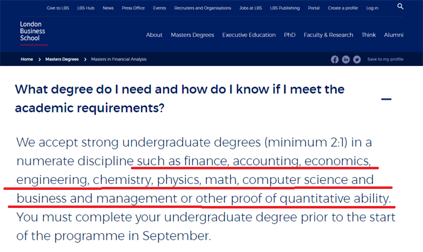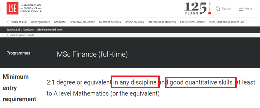 再舉一個例子,倫敦政治經濟學院(LSE)的金融學專業(yè),學術申請要求是擁有任何學科的2:1學位,但同時要求申請學生具備優(yōu)秀的定量分析能力,尤其是在數學方面表現出色。