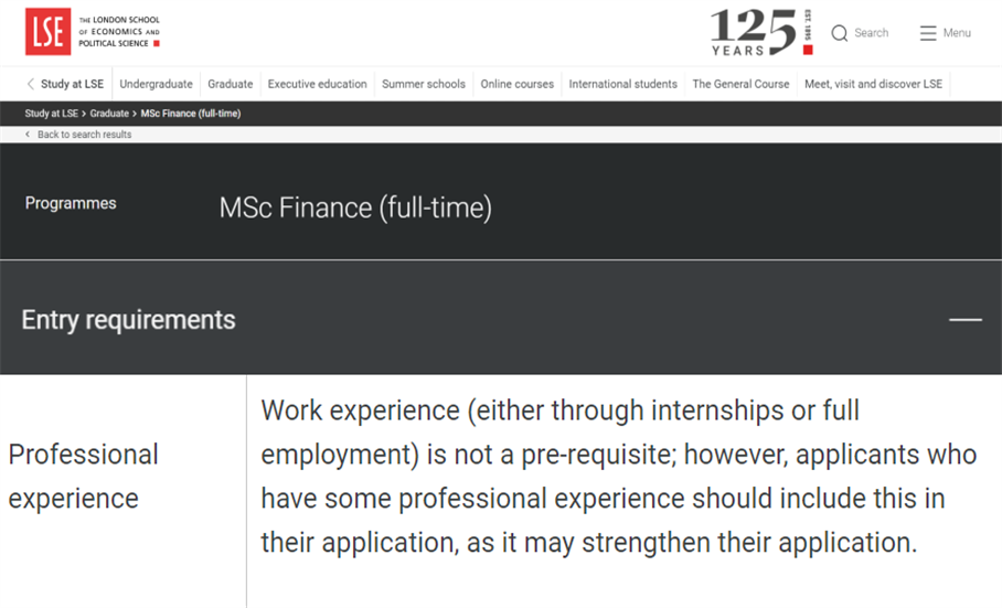 以倫敦政治經濟學院(LSE)的金融專業(yè)為例,學校在“專業(yè)經驗”的申請要求中指出,雖然工作經驗不是申請的必要條件,但它可以增加申請人的競爭優(yōu)勢。因此,建議申請者在申請材料中涵蓋這方面的內容。